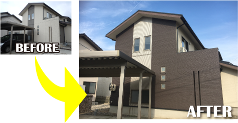 陽当たりの良い南面の劣化が進行していましたが、外壁サイディング工事で色あせや汚れのお悩みが解消。建物の四隅で色を切り替えるトレンドの張り分けでご近所でも評判の仕上がりになりました。サイディングの柄やカラーでモダンでスタイリッシュな外観に変身しました。