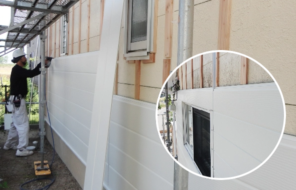 下地完成後、いよいよサイディング本体の取り付け工事に入ります。サイディング材を施工経験豊富な職人が一枚一枚、丁寧に下から順番に張り上げていまきす。